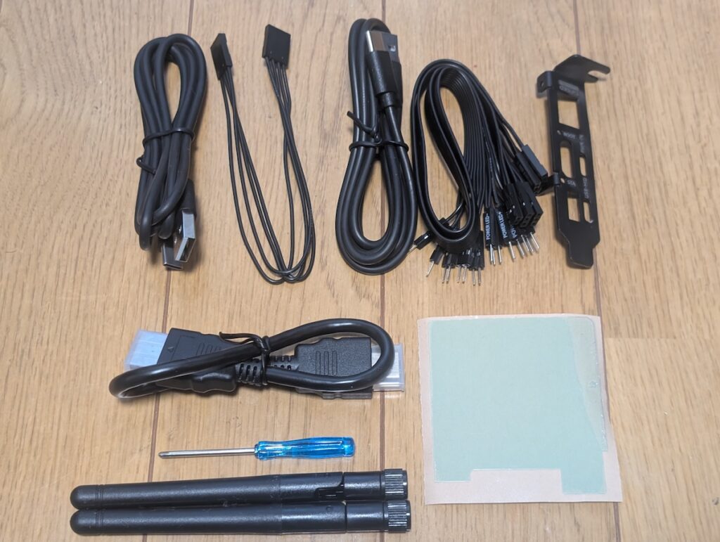 左側のバッグの中身は以下の通り。組み上げてわかったのですが、左下のWifiのアンテナと右上から2番目のコードは2セット入っており (破損しやすいのでしょうか…)、好感が持てました。導入に必要なUSBやHDMIケーブルも同梱されていたのはありがたかったです。右上はロープロファイルな環境で利用するブランケットで、こちらを利用する場合はWifiは利用不可となります。右下のシールはちょっと用途がわかりませんでした。ご存じの方がいらっしゃったら教えてほしいです (基盤に貼ると放熱効果があるとか?)…