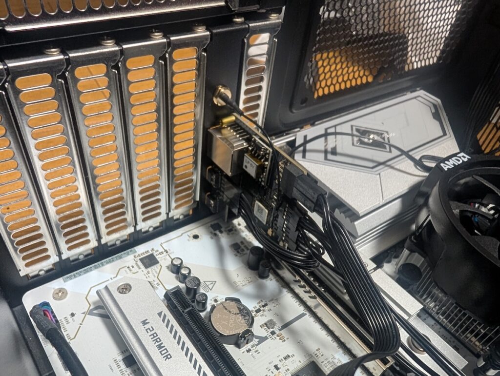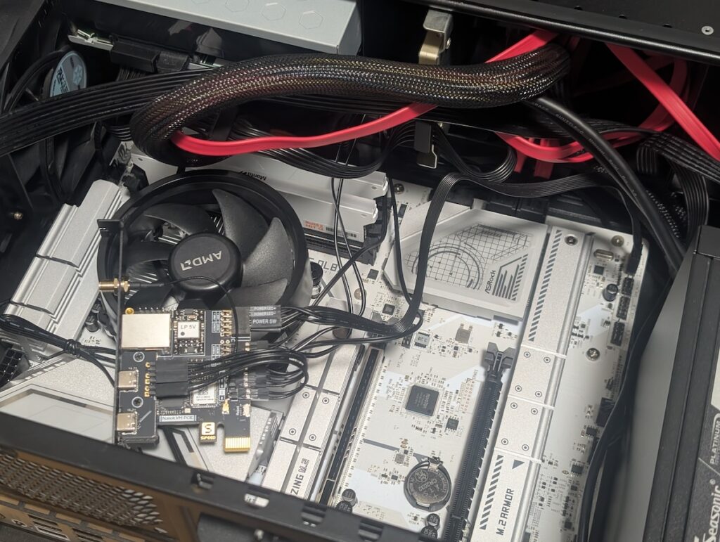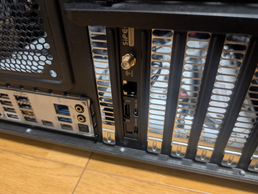 結線を終えてPCIeスロットに挿入すると、以下の写真のような感じになります。この写真だとちょうどケーブルに隠れてよく見えませんが、PCIeスロットに挿入する部分があり (上の写真のほうがわかりやすいと思います)、NanoKVM への電源の供給はここから受けることになります。このため、仮にPCとしての電源がoffの状態でも、PC本体に通電していれば動作するということになります。PCIeの空きスロットがない or PCIeスロットがマザーボードにない場合は、マザーボード上のUSBヘッドと直結する、あるいは外部に出ているUSB Tyep-Cポートに接続して給電することになります (そのためのケーブルも同梱)。