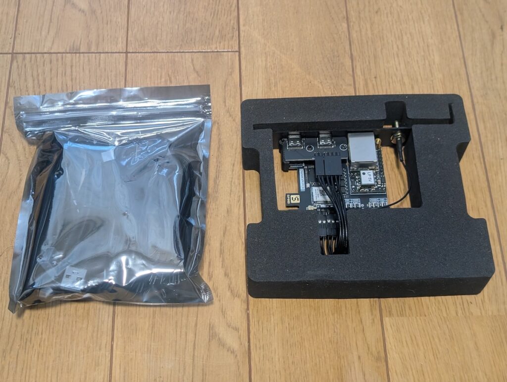 箱の中身は以下の通りでした。肝心のPCIeカードはしっかりとした緩衝材に包まれており、当然ながら破損などは一切ありませんでした (壊すほうが難しそう)。