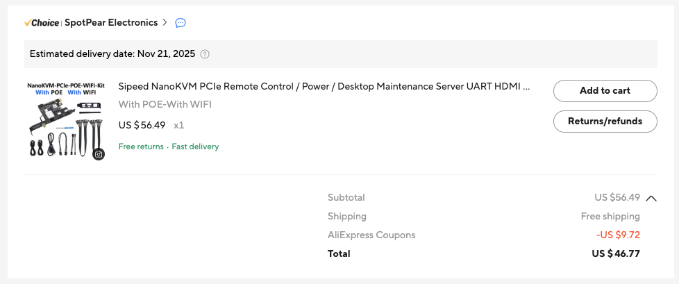 個人が手に届くIP-KVMの取り扱いがあるのはさすがですが、アリエクとはいえ選択可能な製品はかなり限られていました。最終的に管理人が購入したのは Sipeedという会社の “NanoKVM PCIe” という製品でした。価格はクーポンが適用されて$46.77でしたが、Legionの記事で紹介したrakuten.comのキャッシュバックが12%あったので、実質$42 ≒ ¥6,500円くらいでした。IP-KVMとしては激安と言っていいでしょう。